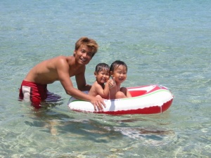 1歳くらいの時にボディーボードをさせて、親としてはちょっとでも大きい波に乗らしてやりたいという職業病が出て、わざわざセットに乗らせて転覆をして水中で洗濯機の中のように回転をしていました。
