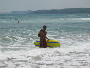 波が来たら後ろからボードを押してあげるのですが、1回間違えて股間を掴んで押してしまいました。