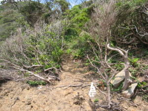 周囲を色々探索して、帰りは目印がある違うルートから登る事にしましたが、どう見ても崖ですよね・・・。