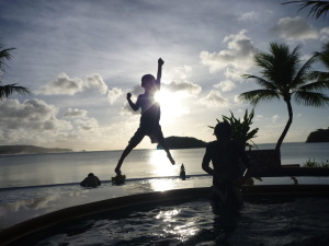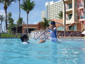 子供たちが食後にホテルのプールに入りたい!と言うので、一緒に入りました。