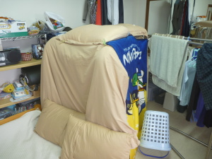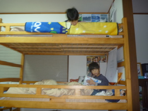 外の会場を簡単に片付けて家に入ったら、すぐにアキラ君ファミリーはいつもの寝袋で就寝タイムに入ってしまいました。 |