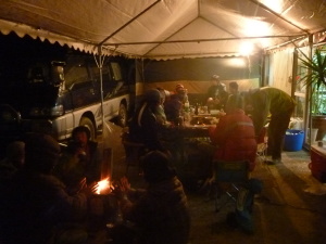 外では男たちがせっせと嫁はん連中のために肉を焼いています。 |